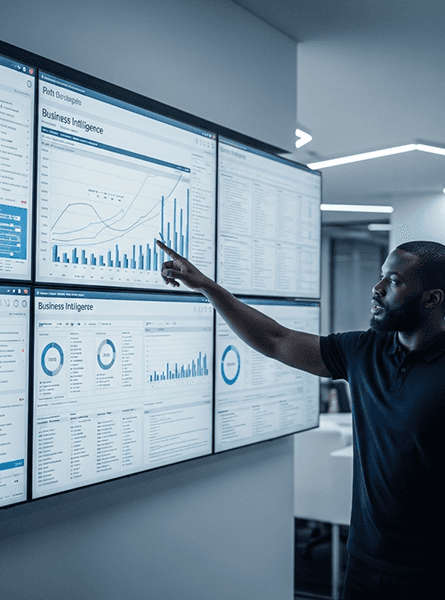 Com dashboards e relatórios gerenciais, as informações passam a ser visualizadas de forma simples e atualizada, permitindo acompanhar o desempenho do negócio com